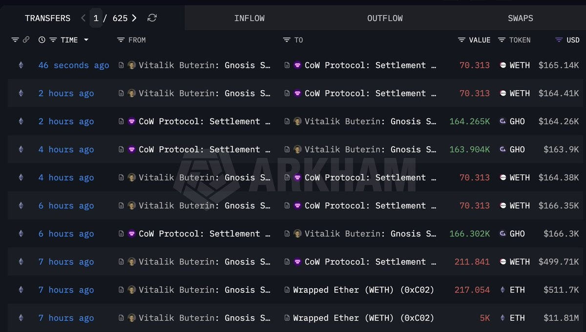 V God sells a large amount of ETH Ethereum founder Vitalik continues to sell ETH. In the past 8 hours, 493 ETH have been sold, with a total value of 1.16 million dollars.