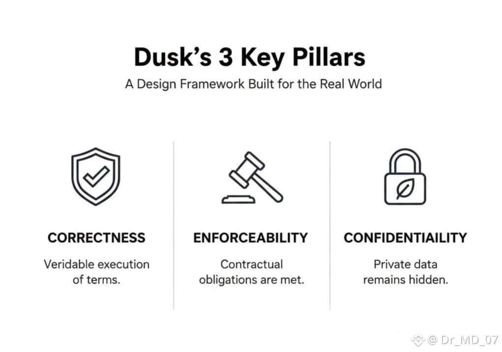 Strip a digital agreement down to the basics and you find three things that matter: correctness, enforceability, and confidentiality. Most blockchains get the first two right and let the third one slide. Public ledgers can prove something happened, but they’re terrible at keeping secrets. Dusk turns that on its head. Privacy isn’t a bonus feature it’s the foundation. The framework is built so that you can check whether rules were followed, but you never get to peek at the raw data behind the scenes.