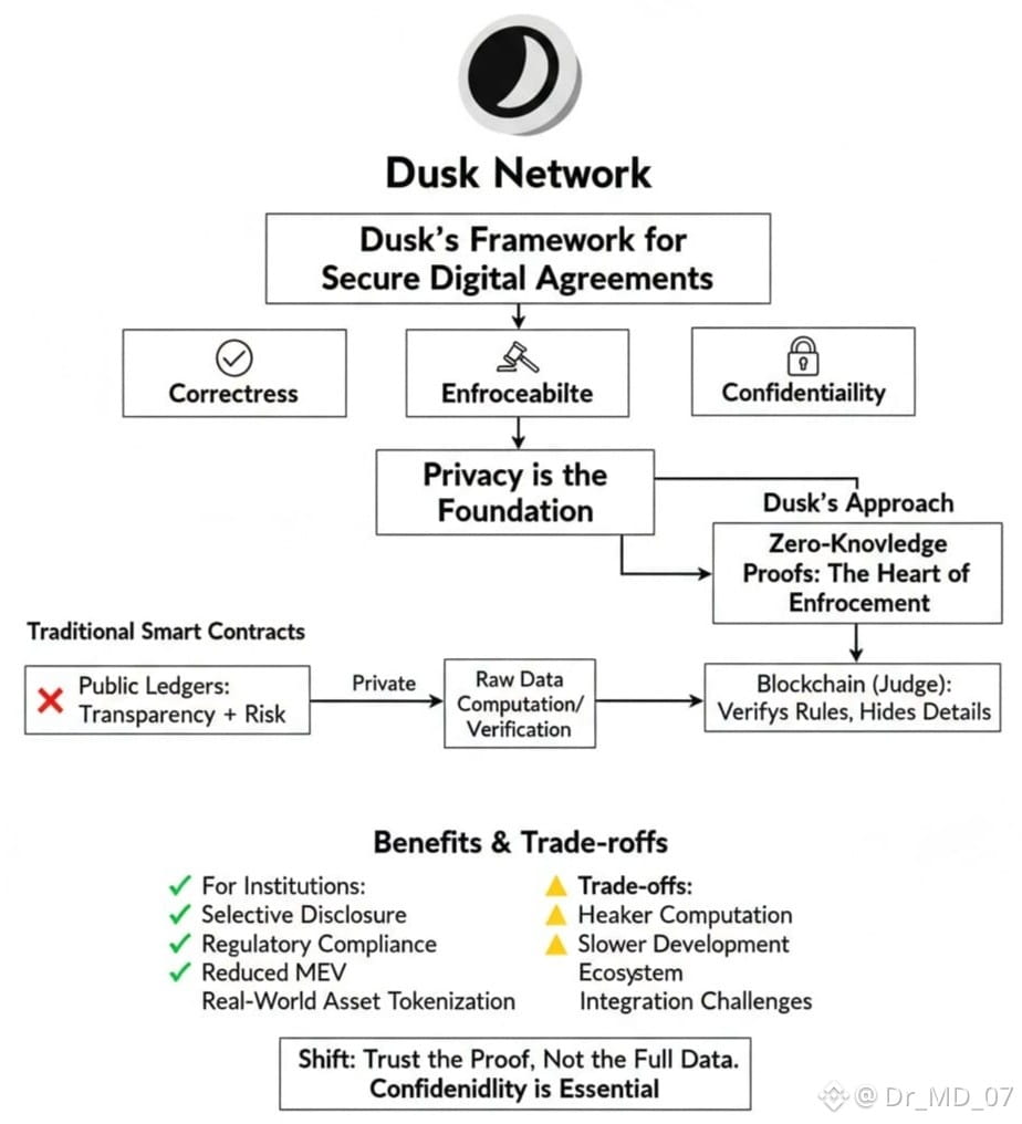 For me, what’s striking is how Dusk flips the idea of trust. Instead of saying, “Trust the code, even though it shows you everything,” it says, “Trust the proof it reveals nothing except that the rules were followed.” That’s a quiet but profound shift. It brings blockchains closer to how serious, real-world agreements actually work, where confidentiality isn’t optional it’s essential.