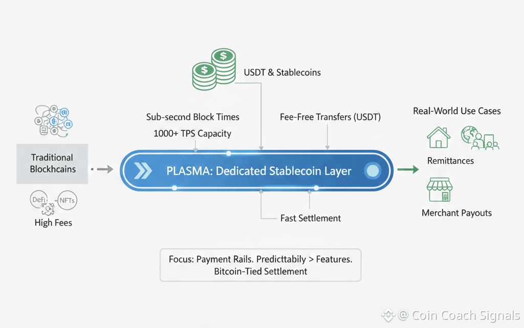 This is where Plasma comes into the picture. Not as a miracle fix, but as a focused rethink of the base layer. It behaves like a dedicated conveyor belt for stablecoins. Block times under a second. Capacity for more than a thousand transactions per second. Fewer bottlenecks. The design prioritizes payment speed and cost efficiency, with deep integration around assets like USDT so transfers can be fee-free in many cases. What it avoids is the everything-at-once approach. No chasing every DeFi narrative. No NFT cycles. The focus stays on payment rails, tightening performance where it actually matters. Consistency during peak usage. Smoother settlement paths tied to Bitcoin. For remittances and merchant payouts, predictability matters more than features. That’s how habits form.