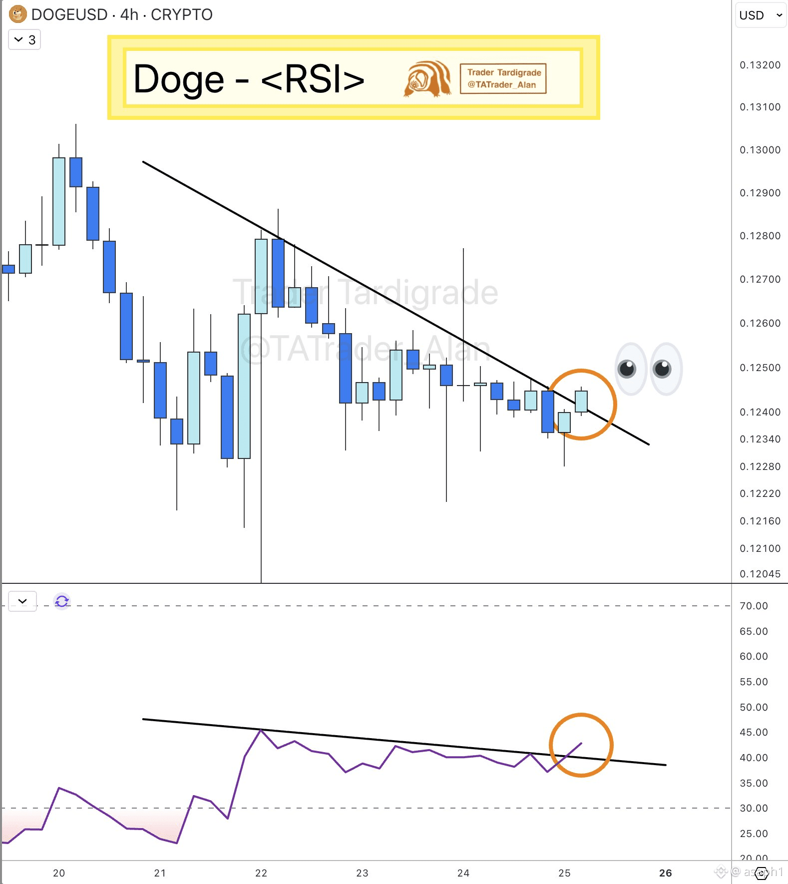 Mira bien esa imagen que te comparto, porque ahí está el secreto del éxito de esta semana. Si te fijas en los círculos naranjas, tanto en el precio como en el RSI (Índice de Fuerza Relativa), estamos viendo una ruptura de tendencia bajista en el gráfico de 4 horas. ¿Qué significa esto en español claro? Que el precio estuvo atrapado bajo una línea de presión que no lo dejaba subir, ¡y acaba de cruzarla hacia arriba! Es como si Doge estuviera tomando impulso después de un largo descanso, y el hecho de que el RSI también rompa su propia resistencia confirma que hay fuerza real detrás de este movimiento, no es solo humo.