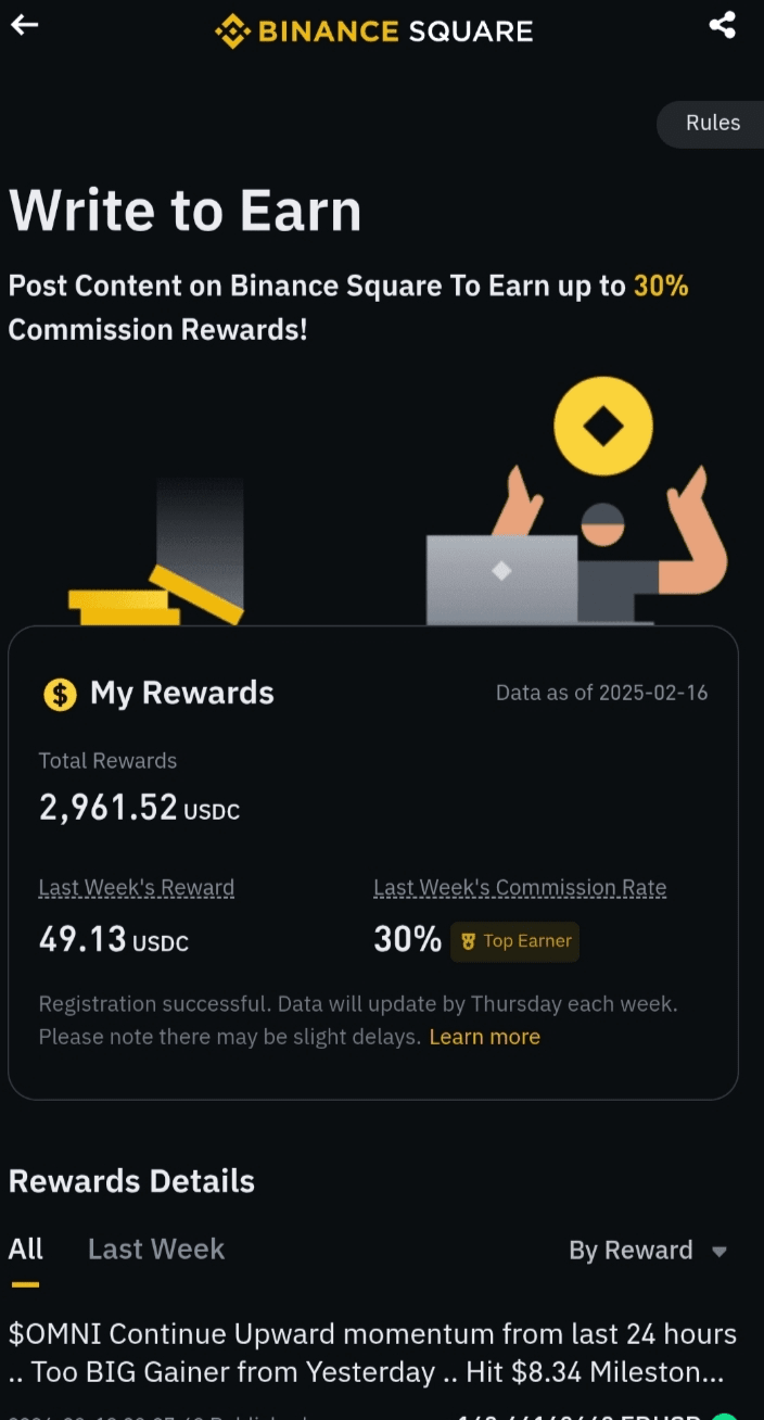 Toda la información es visible dentro de la aplicación Binance en la sección Escribir para Ganar o recompensas para creadores. Las actualizaciones de datos pueden tardar tiempo, y los retrasos ocasionales son normales.