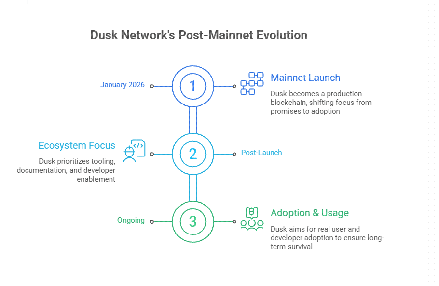 Los lanzamientos de Mainnet son momentos ruidosos, pero lo que viene después es más importante y más incómodo. Después de principios de enero de 2026, Dusk dejó de ser una idea y se convirtió en una cadena de producción, y ahora el enfoque no son promesas, es la adopción, desarrolladores, usuarios y comportamiento real.
