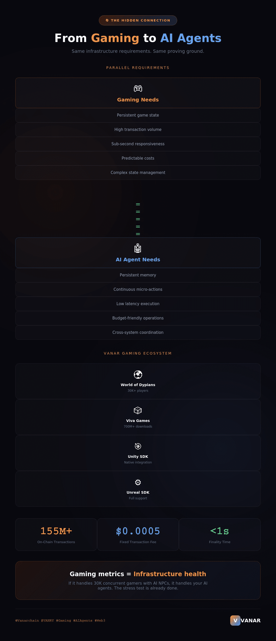 Aquí está la percepción que la mayoría pasa por alto. Los requisitos de infraestructura de juegos reflejan los requisitos de agentes de IA.