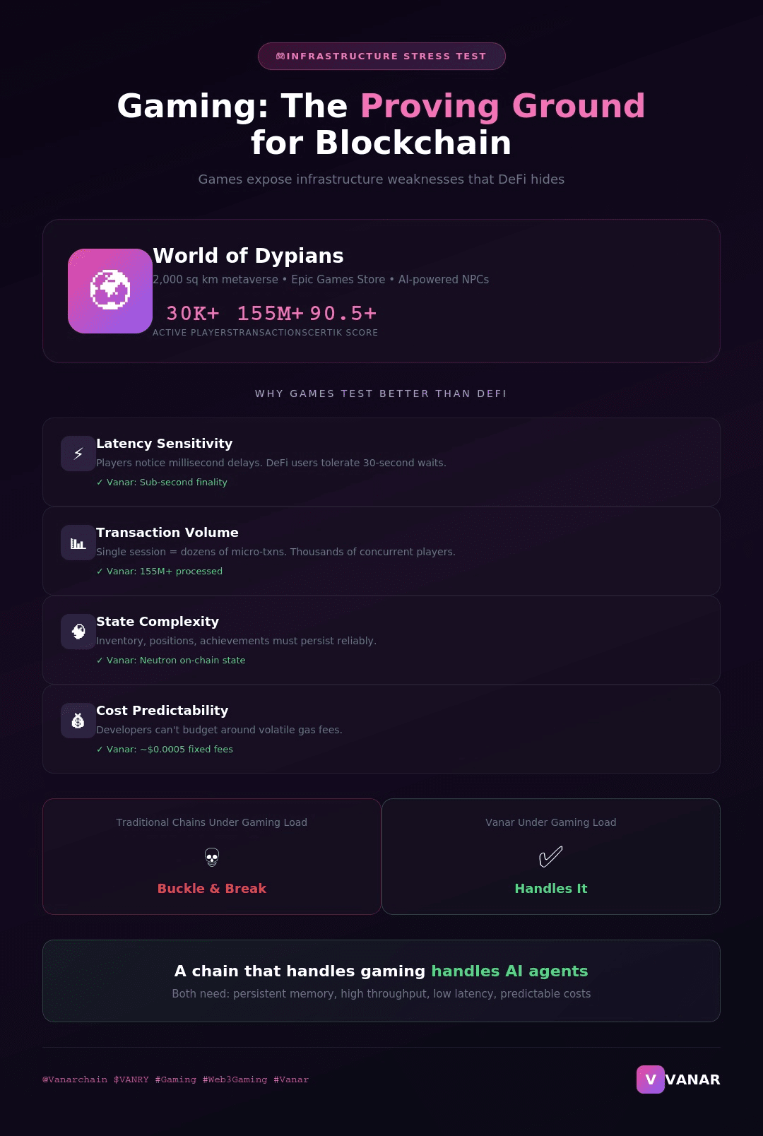 Los juegos son pruebas de estrés brutales. Generan volúmenes masivos de transacciones. Requieren respuestas instantáneas. Castigan la latencia sin piedad. Un usuario de DeFi podría tolerar una confirmación de 30 segundos. Un jugador Alt+F4 después de tres.