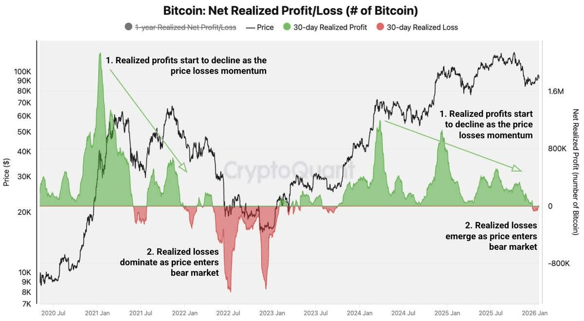 Lo que hace que esta etapa sea especialmente reveladora es cómo se desarrolló gradualmente. No hubo un colapso repentino. La realización de ganancias había estado desacelerándose durante meses. A principios de enero de 2024, las ganancias realizadas eran frecuentes y significativas. Con el tiempo, cada rally trajo menos vendedores que aún estaban en ganancias. Para cuando comenzó 2025, quedaban muy pocos ganadores para vender en fuerza. Silenciosamente, las pérdidas comenzaron a surgir nuevamente.