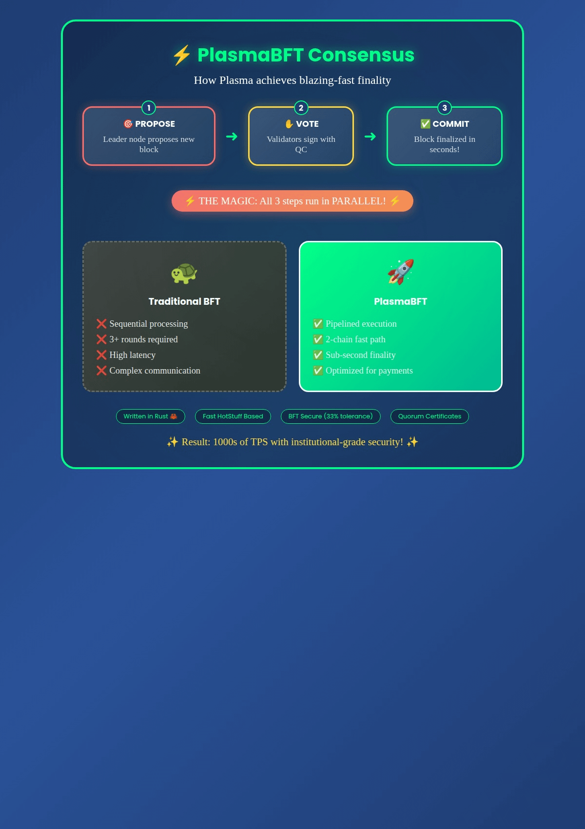 PlasmaBFT surgió de este reconocimiento. Construido como una implementación de alto rendimiento del consenso Fast HotStuff escrito completamente en Rust, el protocolo ofrece lo que las aplicaciones de stablecoin exigen: finalización rápida sin comprometer las garantías de seguridad.