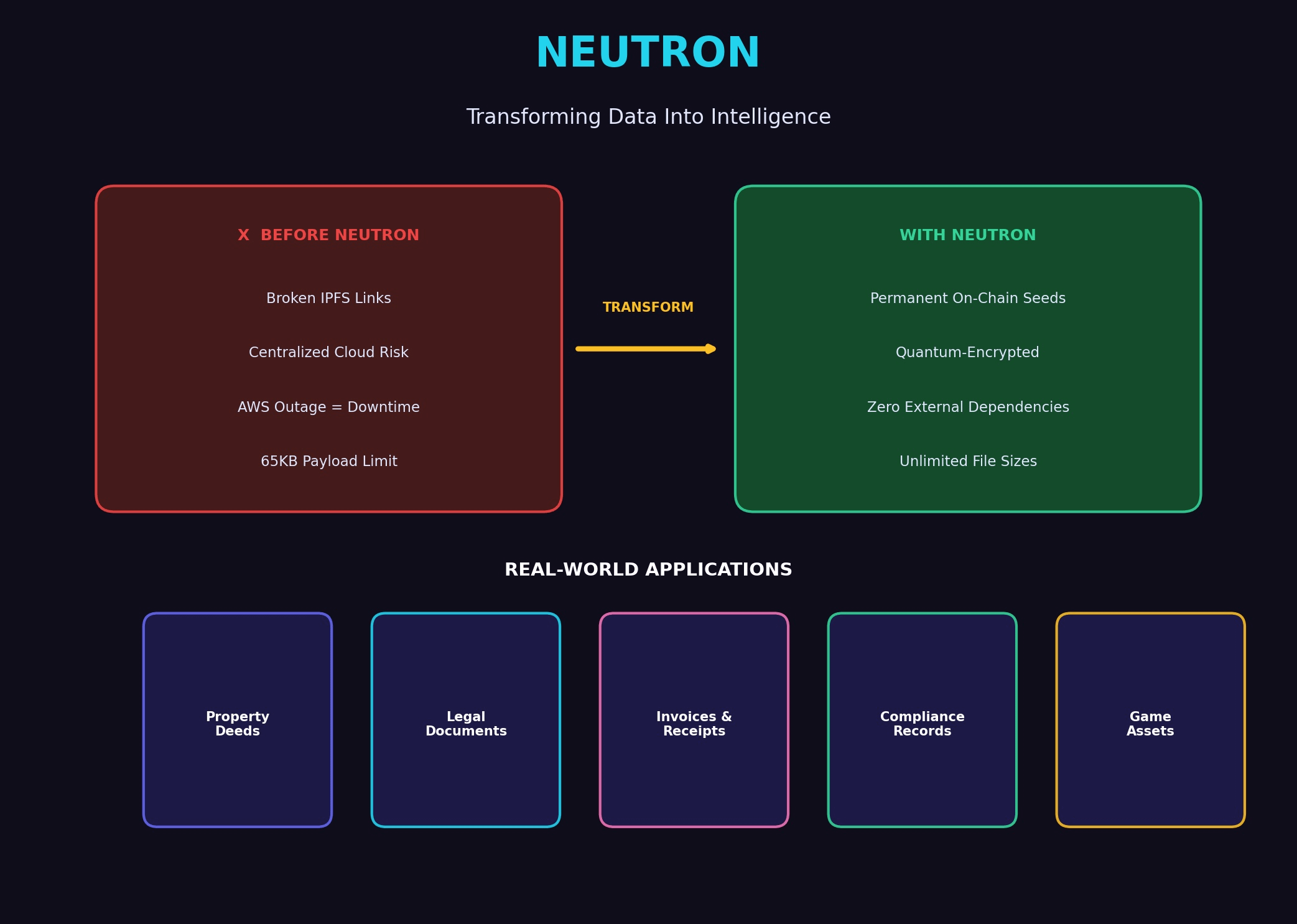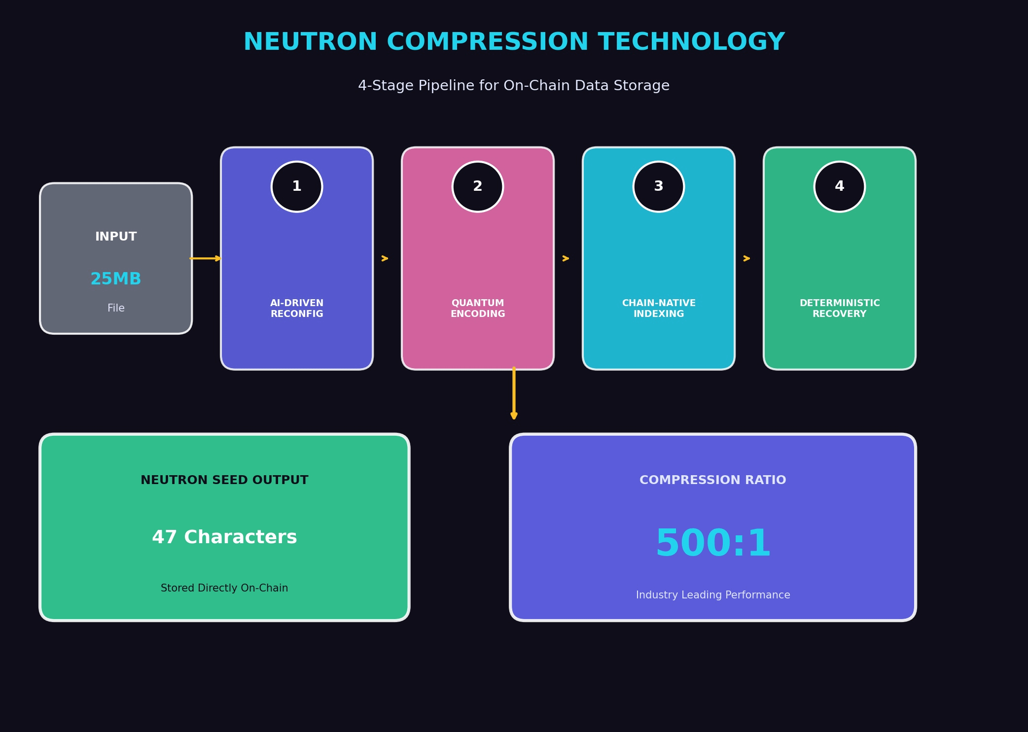 ¿Cómo funciona esto? Neutron emplea un pipeline de compresión de cuatro etapas propietario. La Reconfiguración Impulsada por IA analiza el contenido de los archivos y reestructura los datos para una compresión óptima. La Codificación Consciente Cuántica aplica técnicas criptográficas diseñadas para permanecer seguras incluso frente a futuras amenazas de computación cuántica. La Indexación Nativa de Cadena asegura que los datos se integren sin problemas con la arquitectura de blockchain.