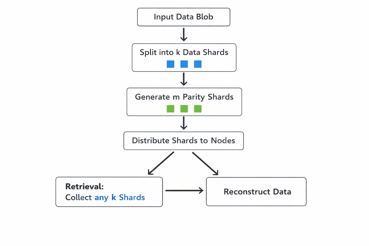 Desglosemos un poco esa codificación de borrado. Introduces un blob de datos. Walrus lo corta en k fragmentos de datos y m fragmentos de paridad. En total, tienes k + m fragmentos, que se almacenan en diferentes nodos. Para recuperar tus datos, solo necesitas cualquier k de esos fragmentos, y algunas matemáticas ingeniosas los vuelven a unir. Esto utiliza menos almacenamiento y ancho de banda que simplemente hacer muchas copias de tus datos, así que es perfecto para manejar los enormes conjuntos de datos necesarios para el entrenamiento de IA.