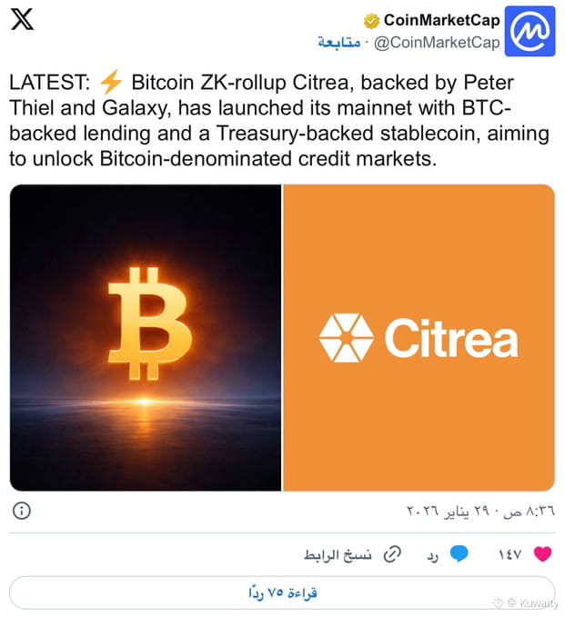 لطالما اعتُبرت $BTC بمثابة الذهب الرقمي، موضع ثقة من حيث الأمان لكنها محدودة من ناحية المرونة المالية. وغالباً ما واجه المطورون صعوبة في تفعيل حالات استخدام مثل الإقراض والائتمان والعملات المستقرة مباشرة على شبكة بيتكوين. إلا أن هذا الواقع يشهد الآن تحولاً ملموساً مع إطلاق الشبكة الرئيسية لـ Citrea. وبدعم من بيتر ثيل وGalaxy، تسعى Citrea إلى توسيع الاستخدام المالي لبيتكوين من دون المساس بمبادئها الأساسية.