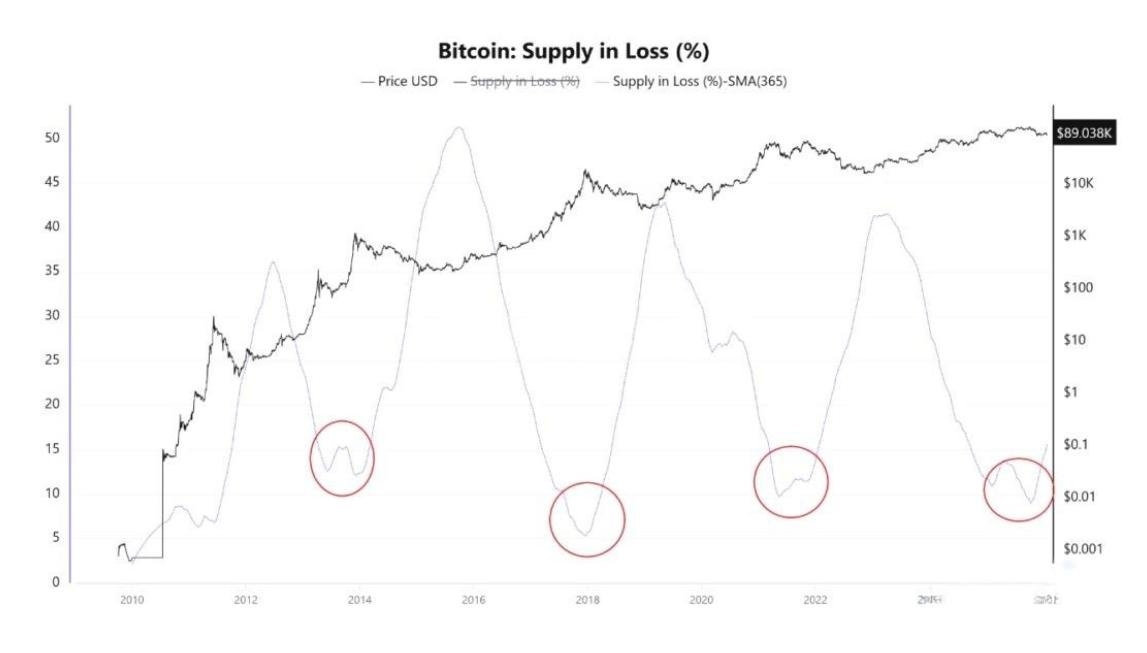 La media móvil de 365 días de CryptoQuant para la "Proporción de la Oferta en Estado de Pérdidas" está empezando a subir. En pocas palabras: cada vez más criptomonedas tienen un precio de coste superior al precio actual del mercado. No se trata solo de inversores minoristas atrapados a corto plazo; las pérdidas se están extendiendo de los especuladores a los tenedores a largo plazo.