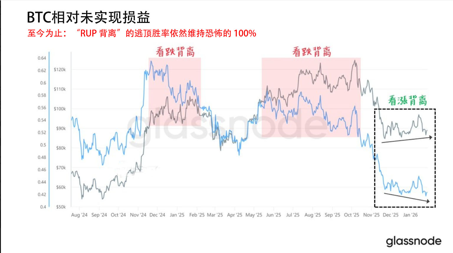 Por otro lado, observamos una divergencia interesante: el inicio de una divergencia alcista de RUP (Beneficios Relativos No Realizados). Los mínimos de precios están subiendo, pero la rentabilidad general está disminuyendo.
