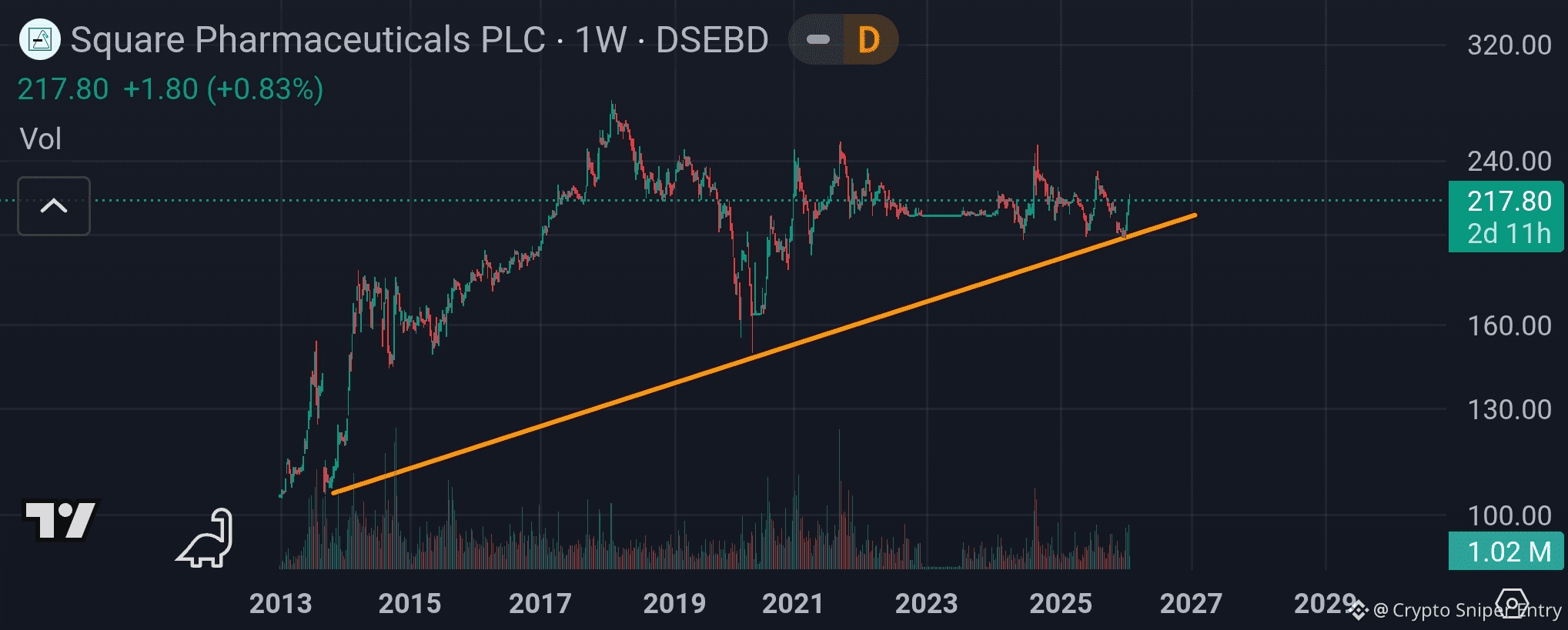 Currently, the price is hovering around 217.80 BDT, sitting right above this major trendline. This zone has historically acted as a strong demand area where buyers step in to defend the trend.