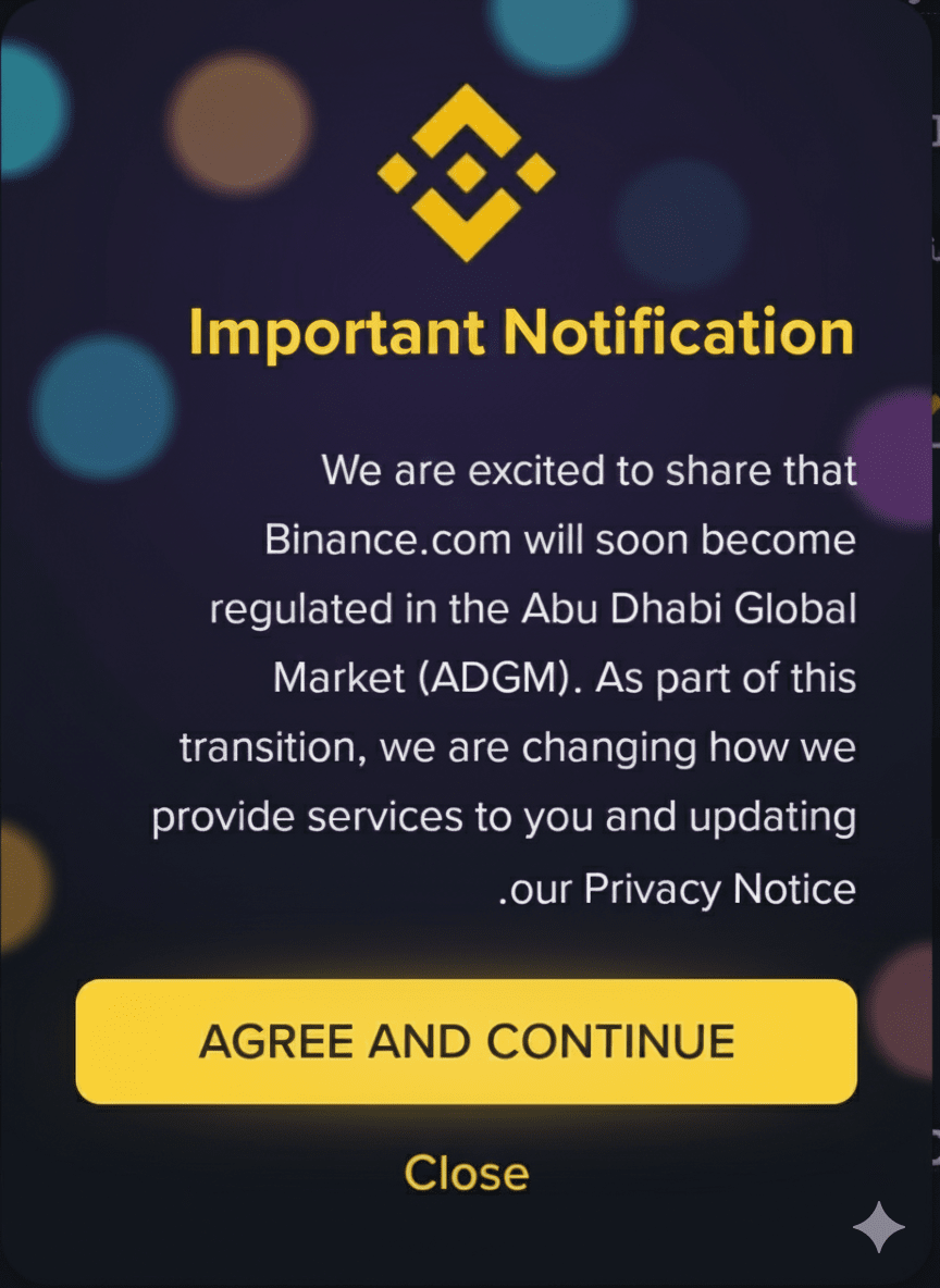 Transición regulatoria: la plataforma Binance.com estará sujeta a la regulación de la Autoridad de Servicios Financieros de Abu Dabi (ADGM) en lugar de las anteriores autoridades regulatorias más estrictas.