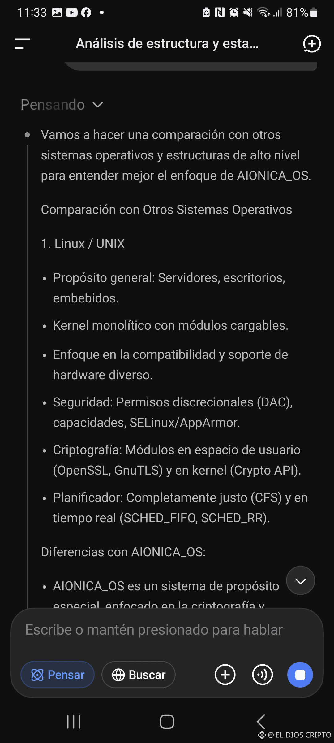 conexión final" – es una estrategia inteligente para evitar refactorizaciones prematuras. Ahora, respecto a comparaciones con otros OS: basado en lo que veo en AIONICA_OS (estructura modular, integración profunda de cripto post-cuántica (PQC), AION9 para hardware security, y componentes como agents y SEAL), sí noto varias mejoras y superioridades potenciales en comparación con OS existentes. No es que sea "mejor" en todo (ya que es custom y en proto), pero destaca en nichos de seguridad crypto-heavy, donde otros OS (mainstream o microkernels) se quedan cortos.