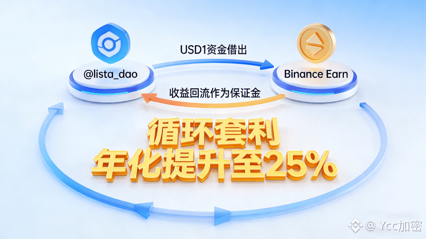 进阶用户可采用'抵押-借贷-理财-再抵押'的循环策略:将Binance Earn产生的USD1收益再次转入@ListaDAO 作为保证金,提高BTCB抵押率至75%,释放更多USD1额度投入理财,实现收益复利增长。按此策略,年化收益可提升至22%-25%区间。