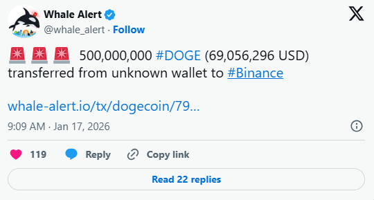 Whale Alert detectó: 5 亿枚 DOGE, transferidos de una sola vez a Binance.