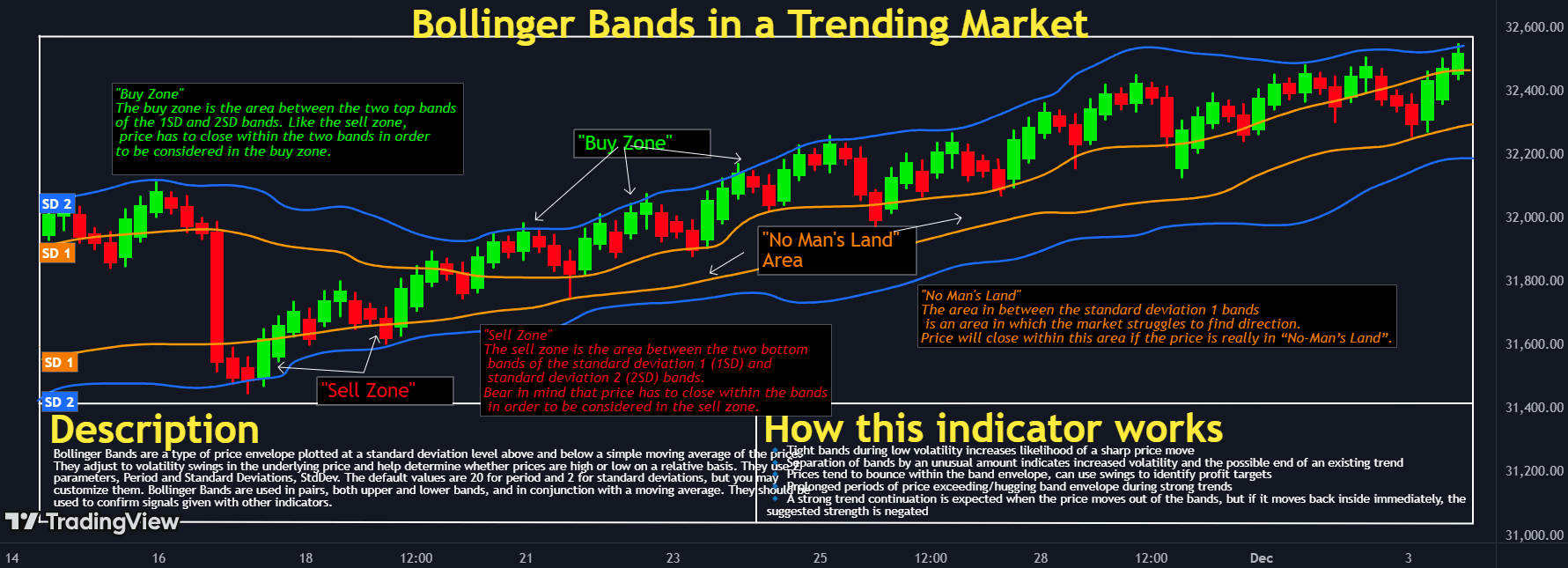 Las Bandas de Bollinger envuelven una media móvil con dos líneas de desviación estándar por encima y por debajo de ella. Cuando las bandas se ensanchan, la volatilidad del mercado es alta; cuando se contraen, la volatilidad disminuye. Los precios que rompen por encima o por debajo de las bandas ocasionalmente indican condiciones sobreextendidas o tendencias emergentes, ayudando a detectar posibles zonas de inversión.