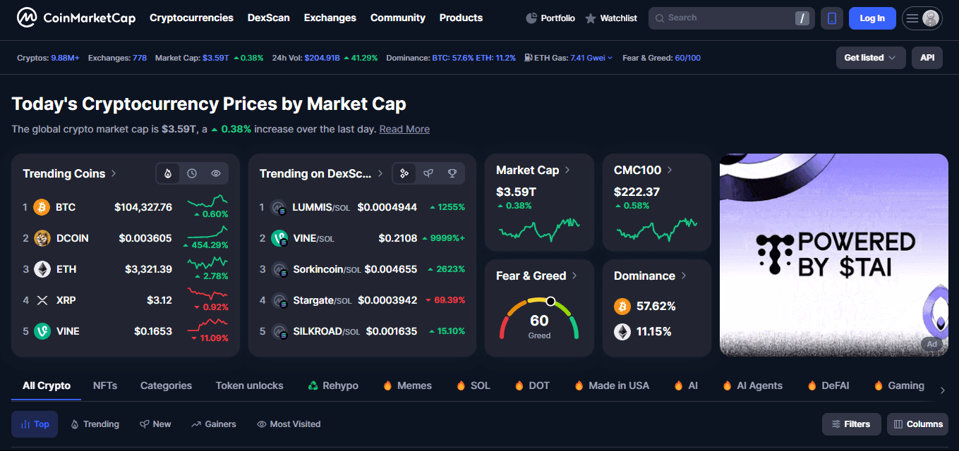 Si bien no es tan sofisticado como TradingView, CoinMarketCap sigue siendo un sitio de referencia para obtener datos rápidos sobre capitalización de mercado, fluctuaciones de precios, volumen de operaciones y clasificación general del mercado. Su función de gráficos es básica pero suficiente para análisis de alto nivel, permitiéndote detectar tendencias de varios días o meses de un vistazo. Los usuarios pueden comparar fácilmente diferentes tokens, gestionar una lista de seguimiento y explorar enlaces relevantes.