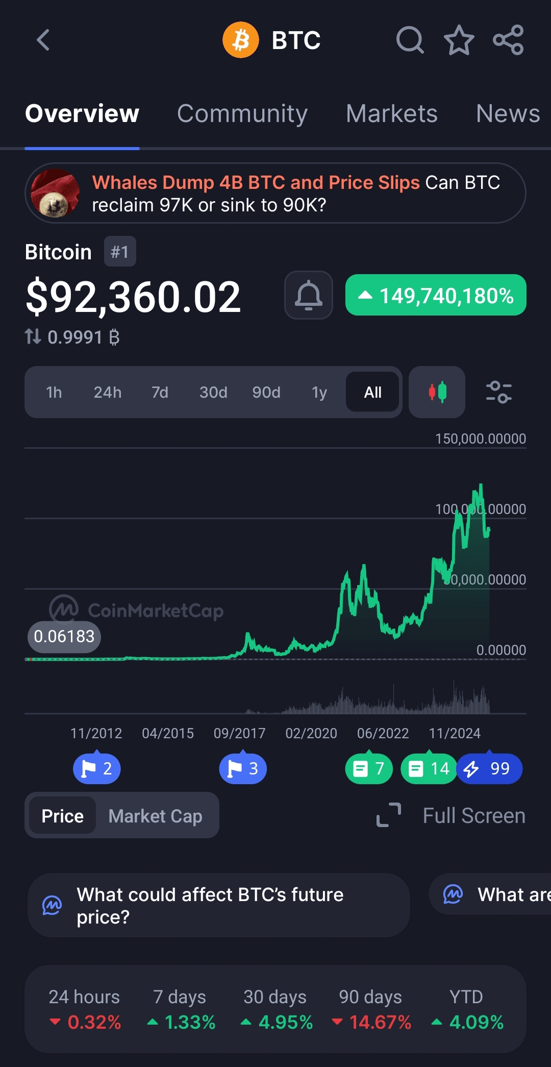 Aunque los traders avanzados pueden buscar en otros lugares para superposiciones de gráficos más profundas, la interfaz simplificada de CoinMarketCap se adapta a aquellos que necesitan puntos de referencia inmediatos o quieren verificar el rendimiento más amplio de las criptomonedas.