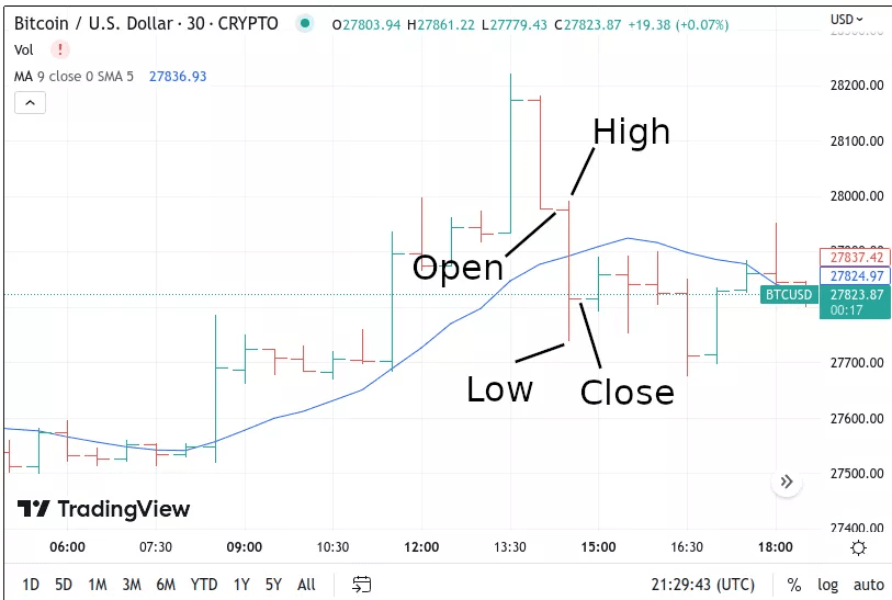 Los gráficos de barras amplían los gráficos de líneas mostrando la apertura, el máximo, el mínimo y el cierre (OHLC) de cada período. Cada barra representa un intervalo de tiempo, mostrando fluctuaciones intradía con mayor precisión. La marca de la izquierda indica el precio de apertura, mientras que la marca de la derecha muestra el cierre. Al ver los máximos y mínimos, puedes evaluar con mayor precisión la presión de compra y venta.
