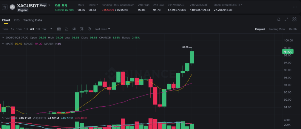 🔹 La plata al contado ($XAG) alcanza $99/oz, un máximo histórico, nunca visto antes