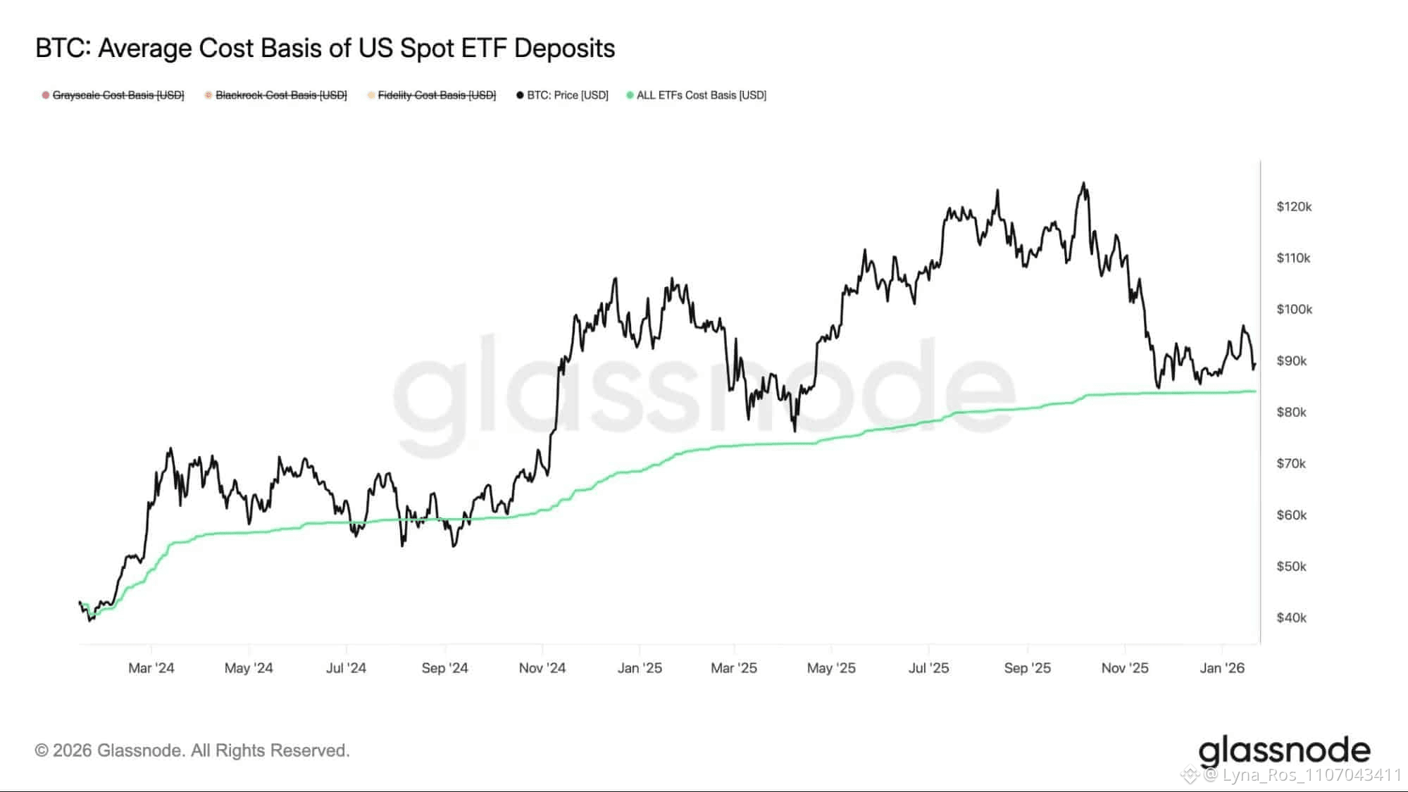 Glassnode data shows the average cost basis for ETF investors is currently $84,099, a level that has repeatedly acted as a key support zone.