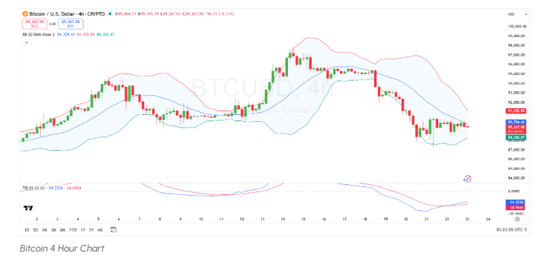 En el último gráfico de 4 horas para Bitcoin, el precio muestra consolidación entre las bandas superior e inferior de las Bandas de Bollinger. El precio probó brevemente la banda media en $89,704, indicando resistencia inicial. Sin embargo, la primera criptomoneda ha retrocedido hacia la banda inferior basada en $88,302, señalando una posible falta de impulso para romper hacia arriba.