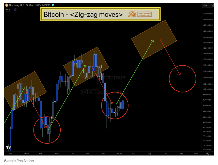 Mirando en otra parte, el analista Trader Tardigrade recientemente señaló en X que Bitcoin ha estado siguiendo un patrón de Zig-zag distinto en el gráfico semanal. Este patrón presenta movimientos alternos alcistas y bajistas, donde los rallies hacia arriba se encuentran con retrocesos subsecuentes, creando un movimiento de ida y vuelta.