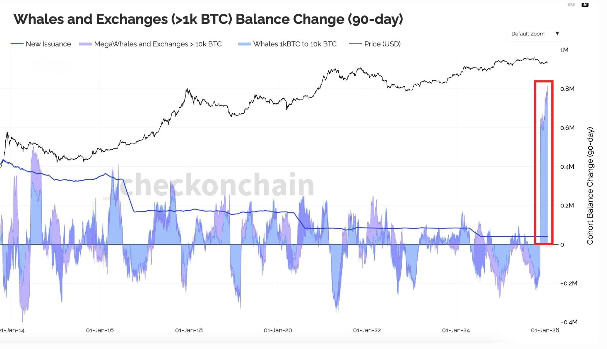Este cambio de saldo de 90 días muestra un aumento pronunciado en la acumulación de carteras con más de 1k $BTC , con mega ballenas y exchanges absorbiendo la oferta agresivamente mientras el precio permanece elevado.