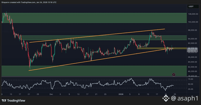 Mira, familia, la cosa está así: Bitcoin intentó romper con fuerza esa barrera psicológica de los $90k, pero el mercado le dijo "¡ahorita no, joven!". El precio se nos fue al piso y ahora estamos viendo cómo lucha por mantenerse en la zona de los $88,000 - $89,000. Lo que está pasando técnicamente es que Bitcoin se salió de una "cuña ascendente" (una figurita que los traders miramos mucho) y eso suele significar que viene una corrección. 📉