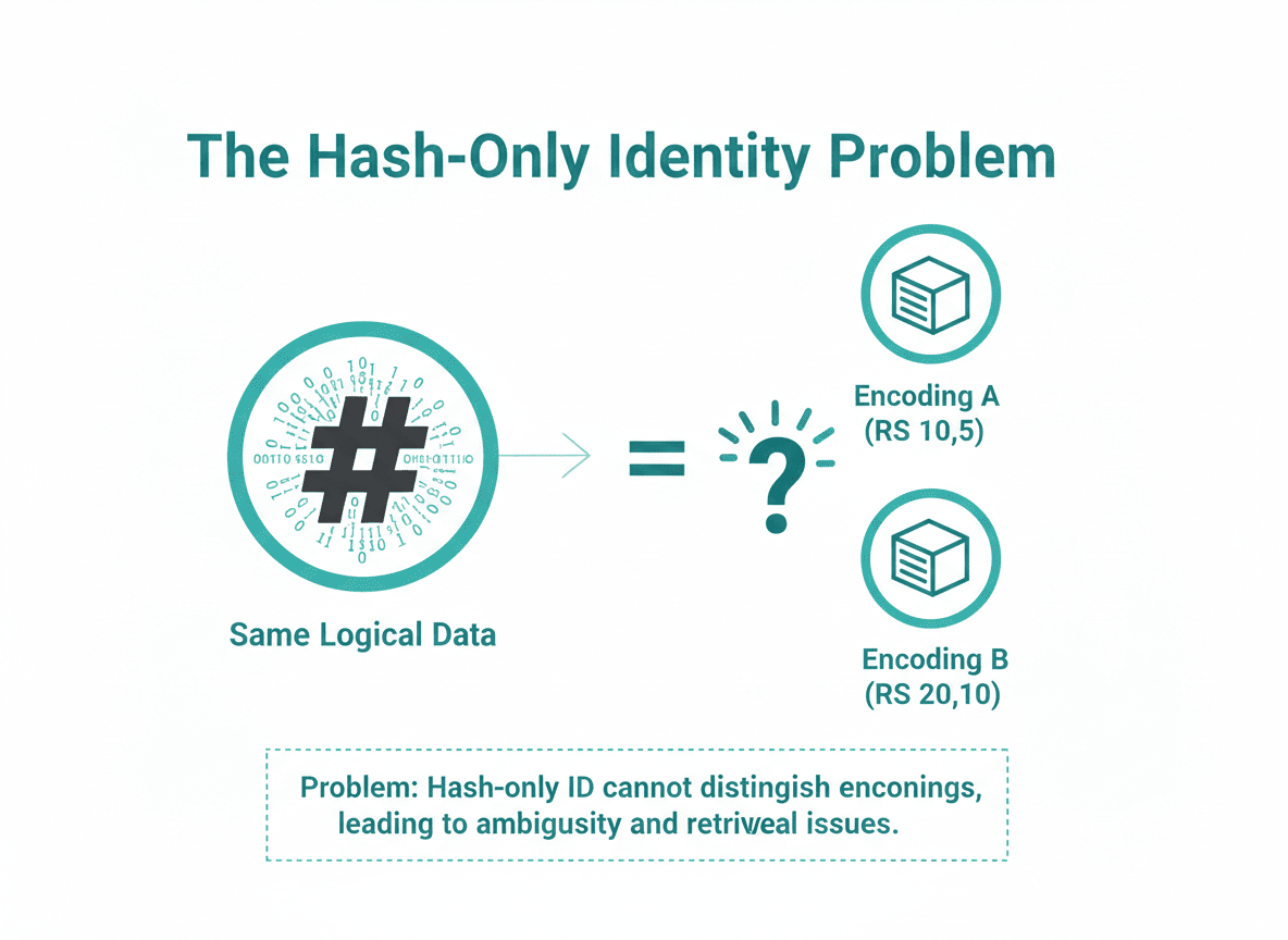 Usando IDs solo hash, estos son idénticos. Los validadores recuperan el blob y no tienen forma de saber qué codificación deberían reconstruir. Los clientes que solicitan el blob no saben qué codificación esperar.