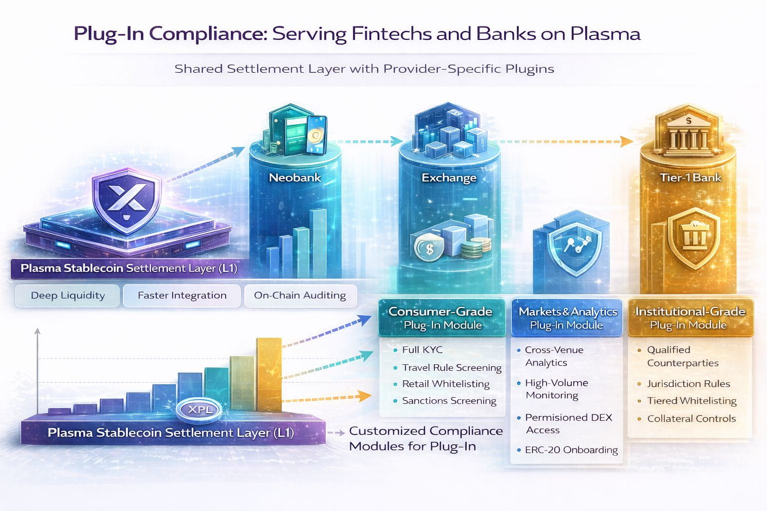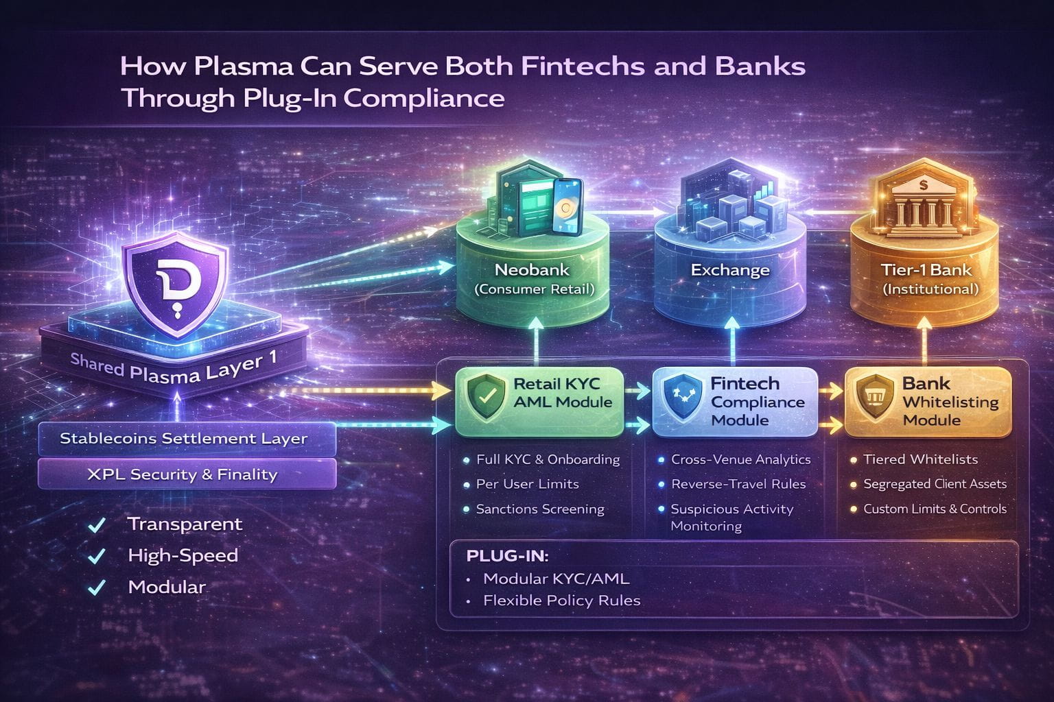 A neobank might choose a consumer grade module: full KYC at onboarding, per account limits, travel rule integrations, sanctions screening, and automated reporting to its national regulator. An exchange may deploy a different module focused on high volume flows, cross venue analytics, and stricter monitoring of suspicious patterns. A tier 1 bank can plug in its own whitelists, jurisdiction specific restrictions, segregation of client assets, and internal risk models. All of this lives on the same Plasma infrastructure, but each institution sees a compliance profile that matches its license and risk appetite.