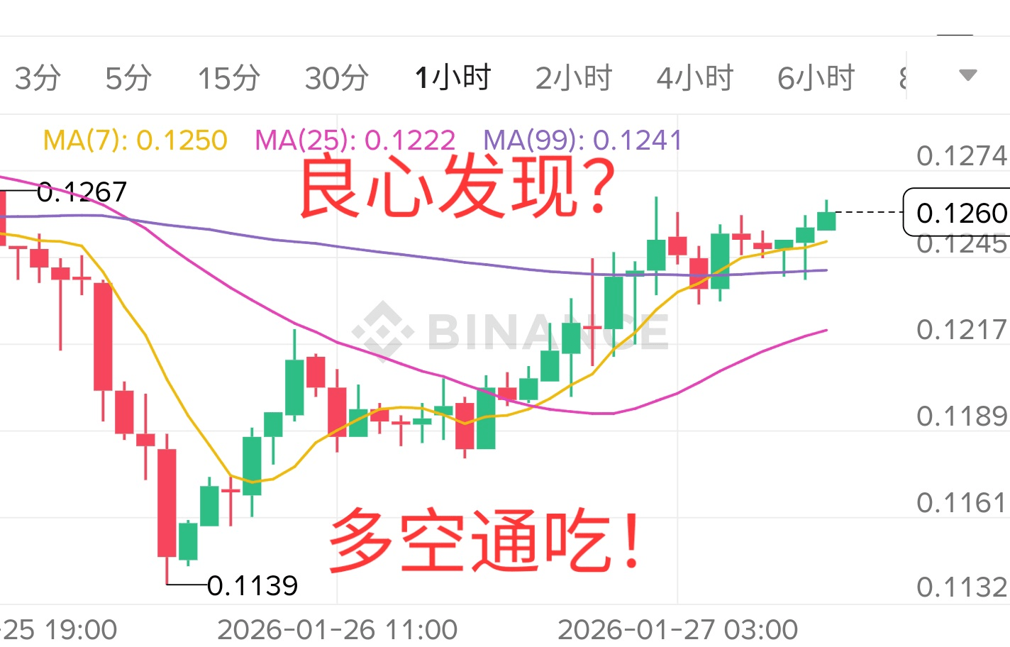 Mira detenidamente este gráfico. Después de que el precio tocó 0.1139, no continuó cayendo, sino que formó un bonito patrón de reversión en V. Ahora el precio de 0.1260 ya se mantiene firmemente por encima de la MA99 (esa línea morada en el gráfico).