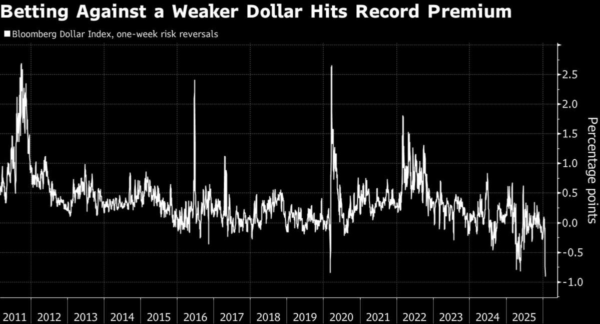 ♻️Hedges bajistas récord. La prima de las opciones put sobre el dólar está en máximos desde 2011. El mercado no solo está valorando 'debilidad', sino 'riesgos de cola' (tail risks). El aumento de las mariposas hasta los máximos de 7 meses confirma: los traders esperan una salida de los rangos, y la dirección de esa salida es claramente hacia abajo.