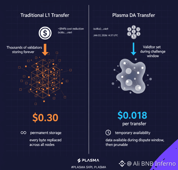 Most people think stablecoin transfers are cheap because the token itself is simple. It's not the token logic that costs you—it's where the data proving that transfer lives. Every byte of calldata you post to Ethereum gets replicated across thousands of nodes, stored indefinitely, and verified by every validator. That permanence has a price. Plasma changes the default by separating data availability from execution. When you use xpl as the DA token, you're essentially paying for temporary, high-throughput storage that rollups and other L2s can pull from when they need to reconstruct state. The data doesn't live on L1 unless there's a dispute or a forced inclusion event. For routine operations—transfers, swaps, batched payments—that tradeoff works.