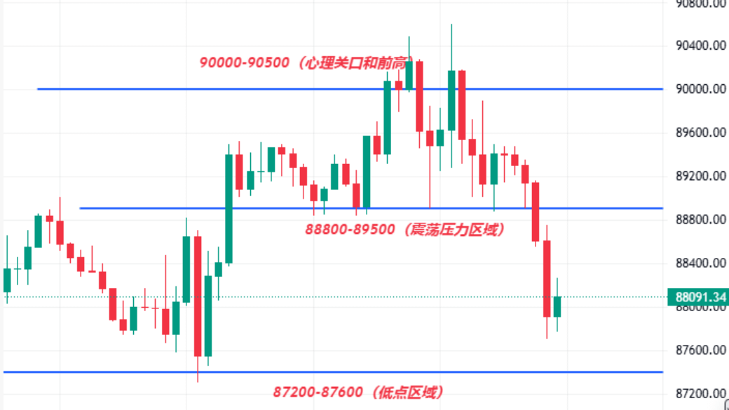 Puntos clave: la zona de resistencia superior se encuentra entre 88800-89500 dólares, si se rompe, se puede mirar hacia los 90000 y el máximo anterior de 90587 dólares; el soporte inferior se centra en la zona de 87500-88000 dólares.