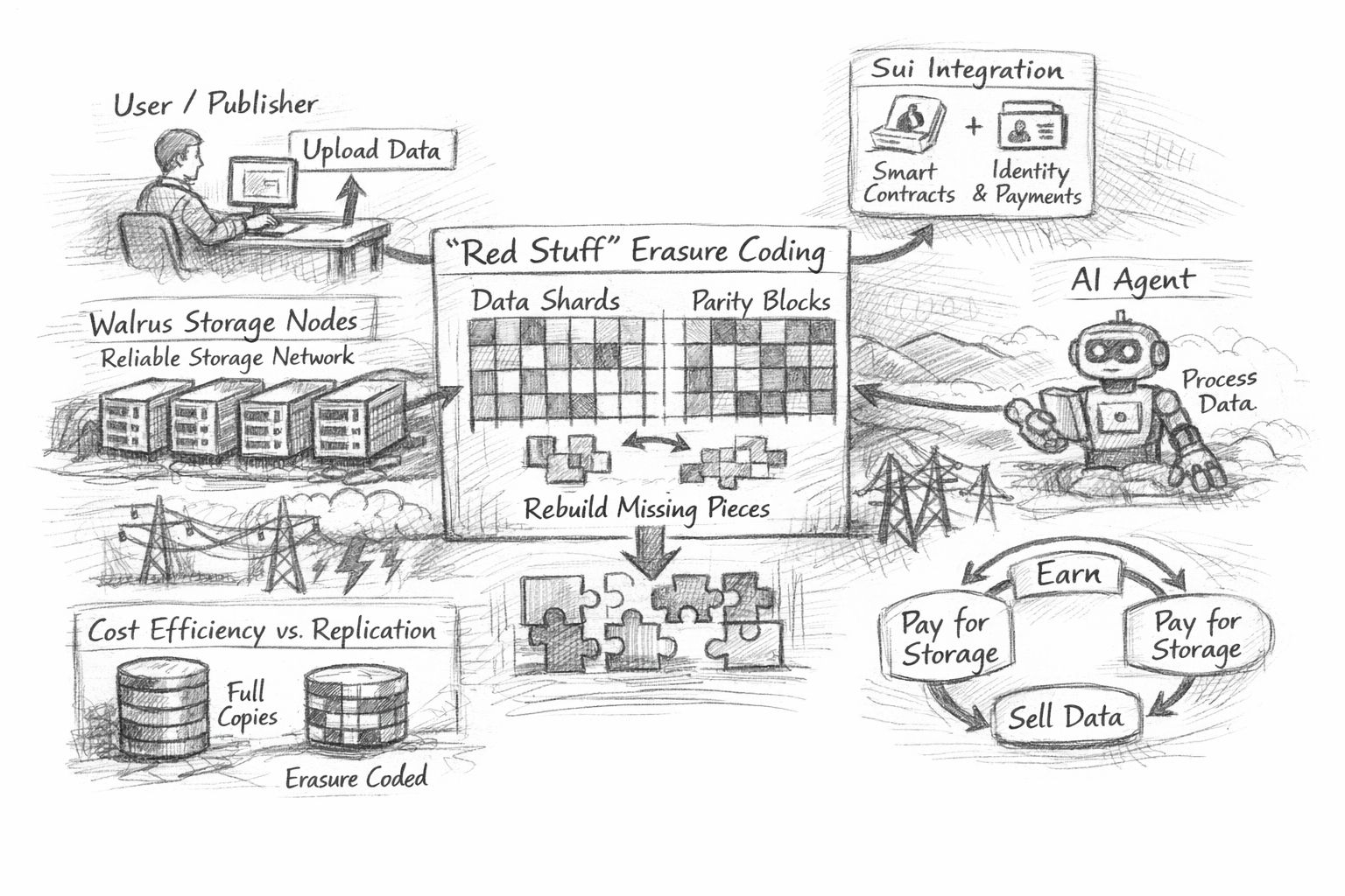 La historia técnica de Walrus se basa en la resiliencia y eficiencia bajo esas condiciones. A un alto nivel, se basa en la codificación de borrado—específicamente un enfoque que llama “Red Stuff”—para dividir los datos en piezas y agregar redundancia para que el blob original pueda ser reconstruido incluso si faltan algunas piezas. La intuición es simple: en lugar de hacer muchas copias completas del mismo archivo en muchas máquinas, divides el archivo en fragmentos y almacenas un conjunto estructurado de fragmentos extra que pueden “llenar los vacíos” cuando el mundo se comporta mal. Walrus describe Red Stuff como un protocolo de codificación de borrado bidimensional diseñado para mantener alta la disponibilidad mientras reduce los costos de almacenamiento que vienen de la replicación pura, y para soportar la recuperación cuando los nodos cambian.