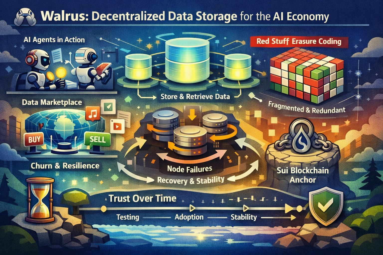 Esto importa porque la base para el almacenamiento descentralizado no es un entorno de laboratorio limpio; es el caos cotidiano. Los operadores cambian. El hardware falla de maneras poco interesantes: los discos se degradan, las fuentes de alimentación mueren, las redes fluctúan. La conectividad es irregular en los bordes y simplemente “suficientemente buena” en muchos lugares donde los equipos realmente despliegan. Las interrupciones regionales ocurren, a veces debido a eventos naturales, a veces debido a proveedores upstream, a veces por razones que nadie puede explicar completamente en el momento. Una red de almacenamiento que asume una participación estable es una red de almacenamiento que te decepcionará precisamente cuando más la necesites. La investigación y documentación de Walrus colocan los costos de cambio y recuperación cerca del centro del problema de diseño, lo que es una señal tranquila de seriedad: es más fácil demostrar una carga de ruta feliz que ingenierar un sistema que trate el cambio como normal.