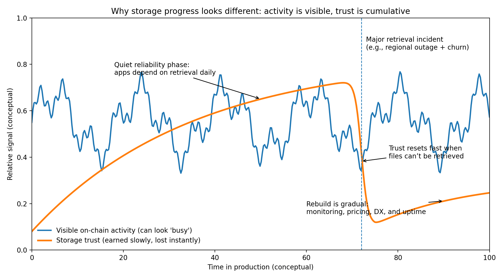 Vale la pena reflexionar sobre por qué el almacenamiento es una promesa más difícil que la computación. Los problemas de computación son generalmente locales y solucionables: vuelves a ejecutar el trabajo, cambias la máquina, y una interrupción se convierte en un informe y un parche. Los problemas de almacenamiento se sienten más pesados porque los datos perdidos pueden estar perdidos para siempre. Puedes simular actividad de computación al spamear llamadas baratas, pero no puedes simular años de recuperación confiable. Un equipo serio no le importa que una red de almacenamiento pueda aceptar cargas hoy si no están seguros de que esas cargas aún serán recuperables el próximo trimestre, el próximo año, y después de que los operadores originales se hayan ido. Esa es la razón por la cual la confianza en el almacenamiento se gana lentamente y se pierde instantáneamente. También es por eso que la adopción tiende a llegar más tarde de lo que las narrativas sugieren. Los costos de cambio son altos, y el modo de fallo es brutal: no solo rompes una aplicación, rompes su memoria.