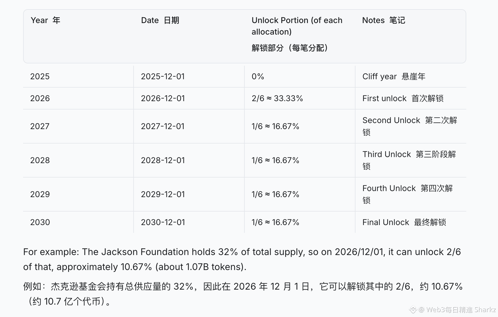 流通率低 + 后续空投/解锁催化仍在(团队解锁代币,需要达到价格和年份两个条件)