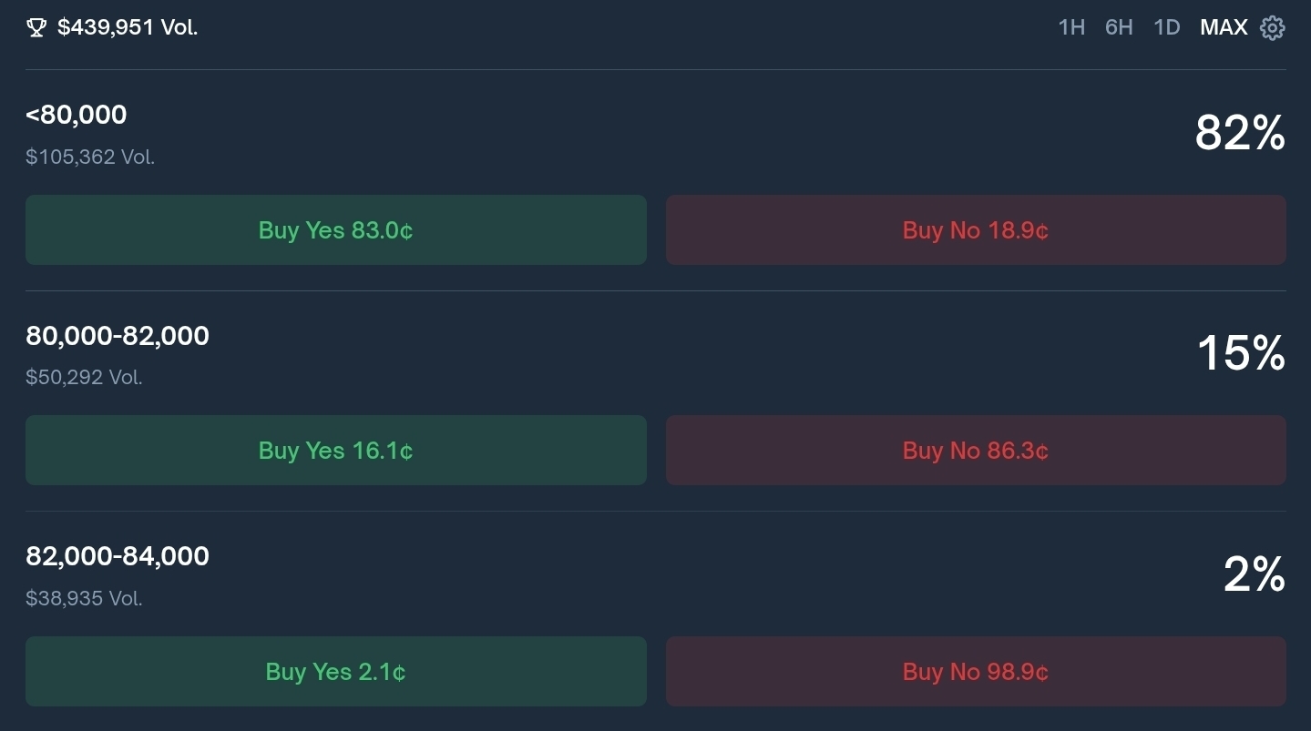 📍El pronóstico de la mayoría en Polymarket para hoy y mañana nos da el rango de precios más probable por debajo de 80k. Para ser honesto, estoy pensando si continuar este departamento con Polymarket o no, sus pronósticos no están funcionando tan bien, y además han dejado de proporcionar rangos en nuestras áreas, simplemente dan un rango por debajo de algún número. Si mañana es lo mismo, dejaré de publicarlo.