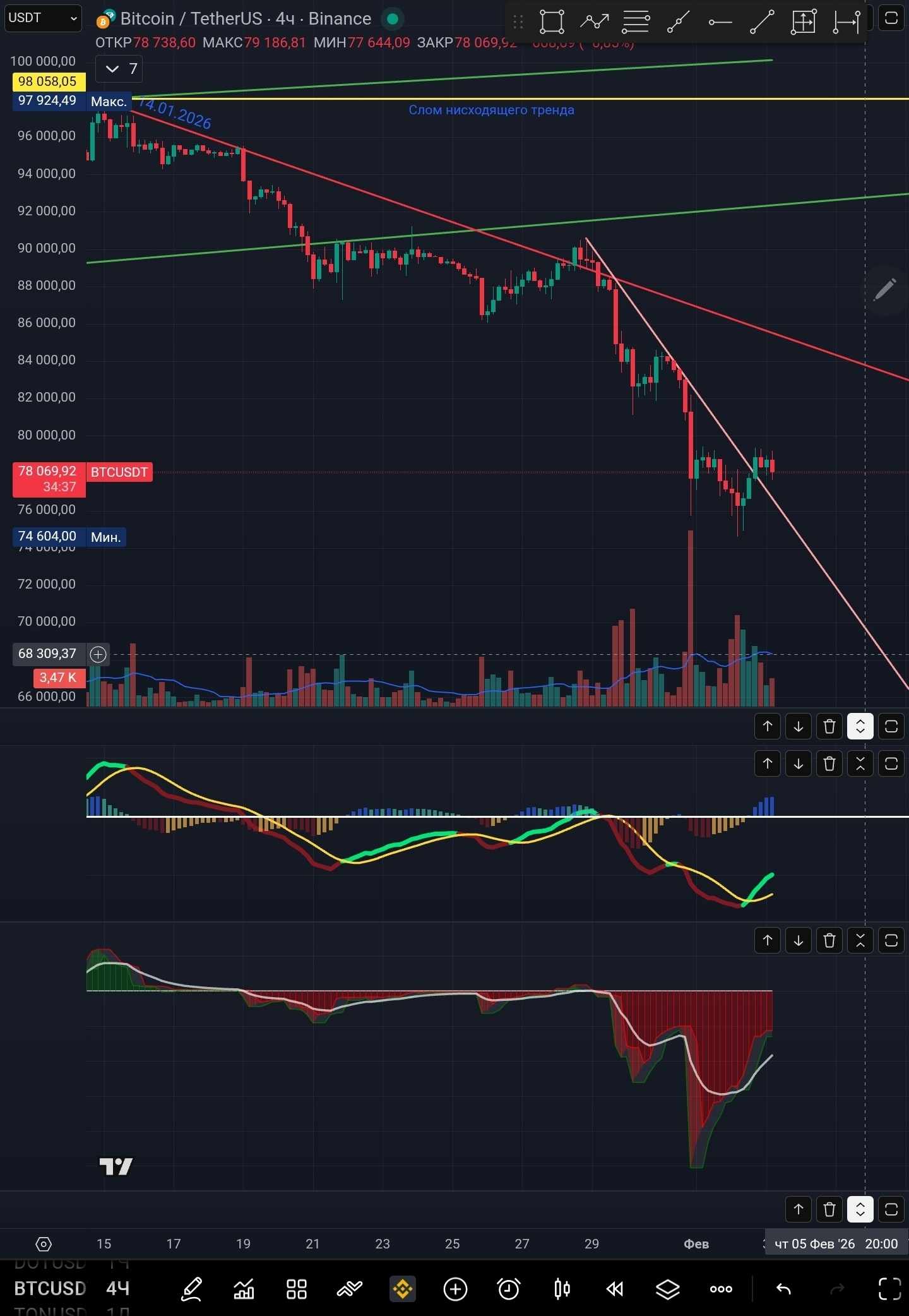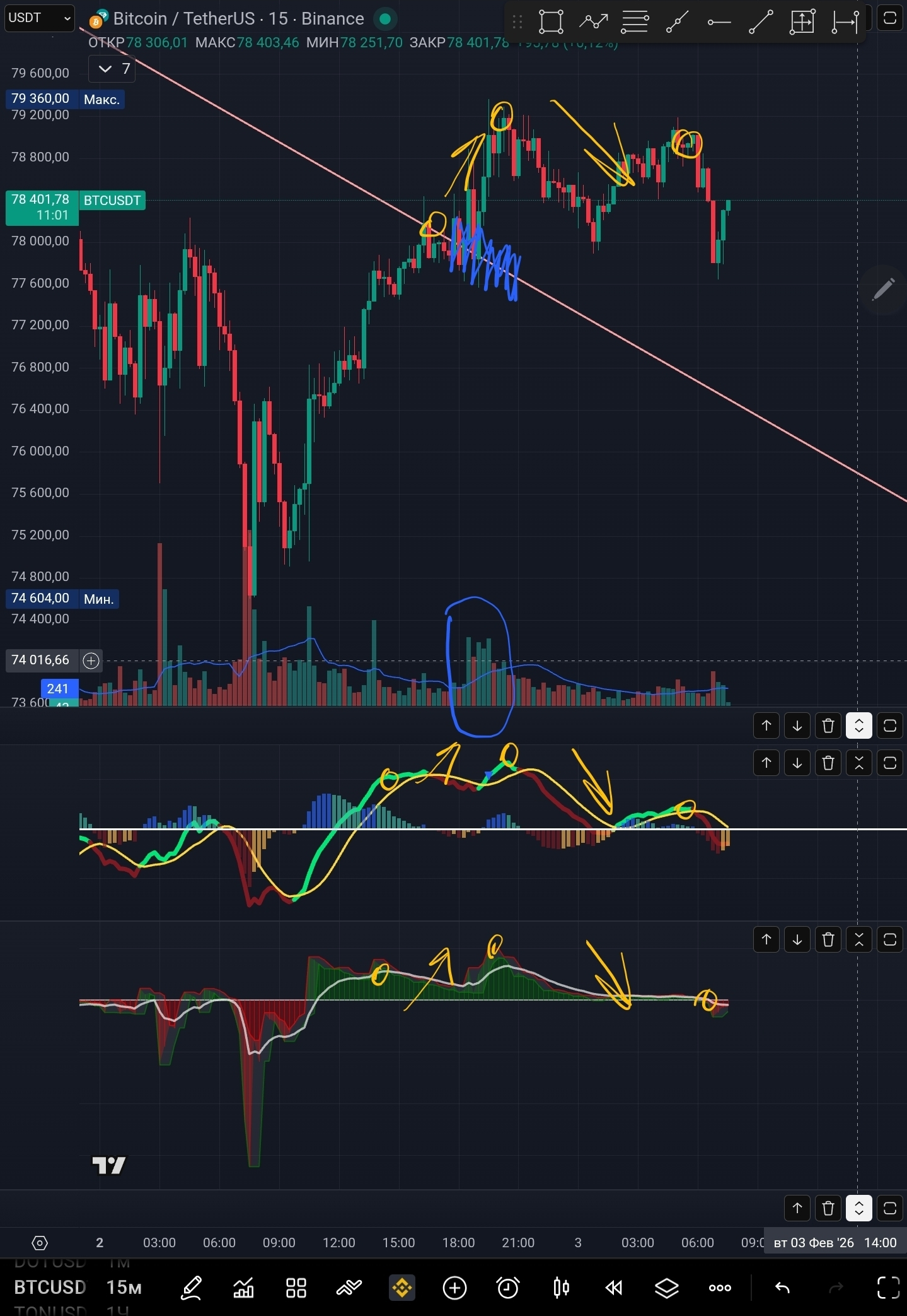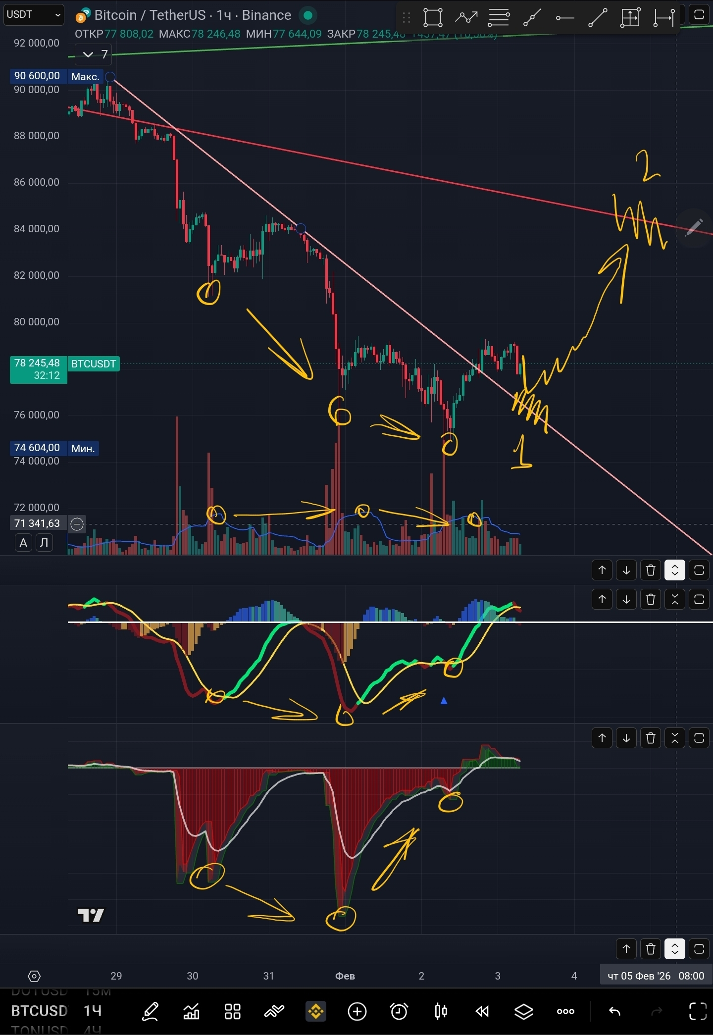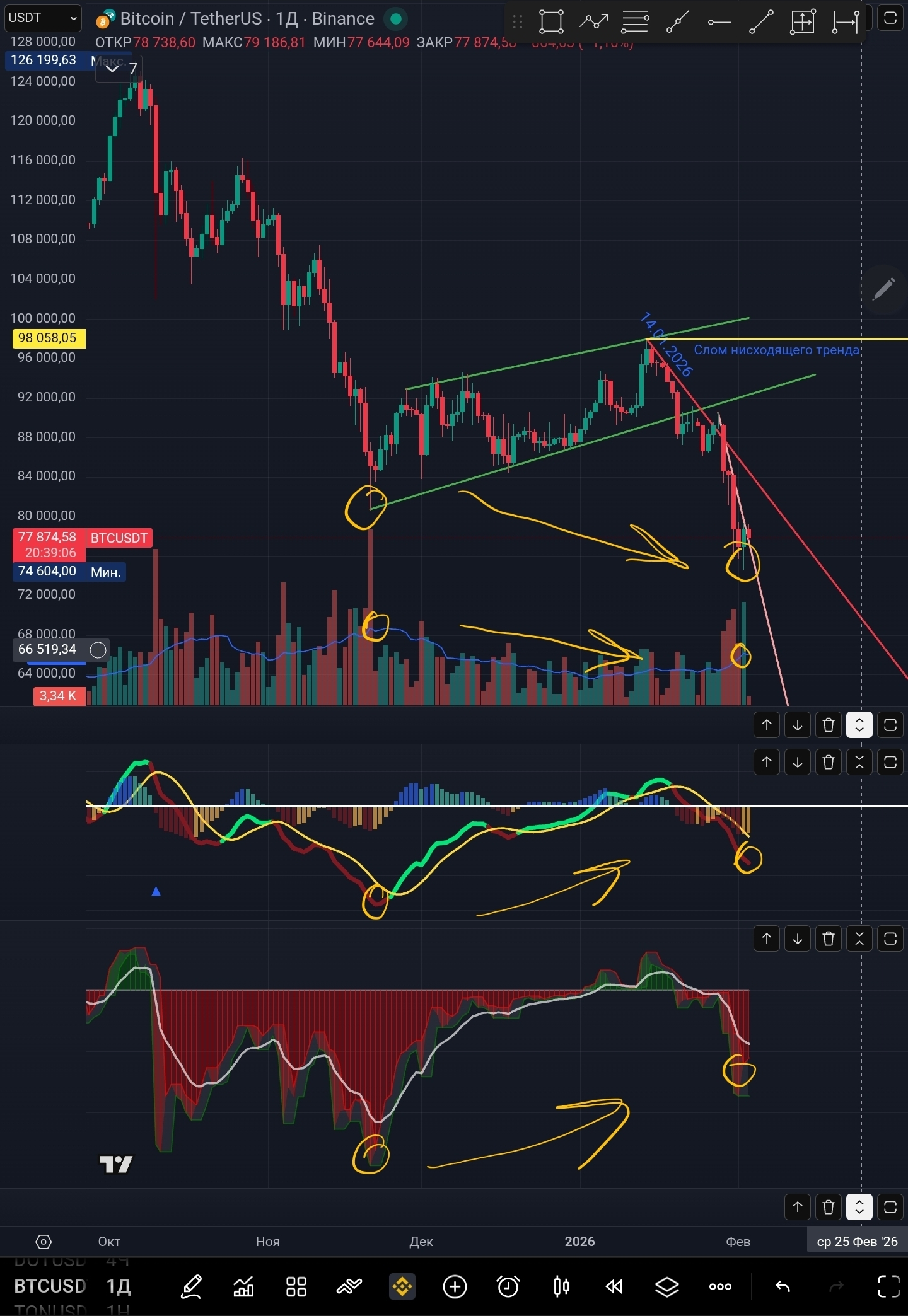 Hoy hagamos un análisis $BTC desde el lado de la divergencia. En las velas diarias vemos una formación diversa de divergencia con volúmenes, con el indicador MACD y el índice de fuerza. Es una muy buena señal, pero hay que esperar un mínimo claro, ahora está formado aún débilmente.