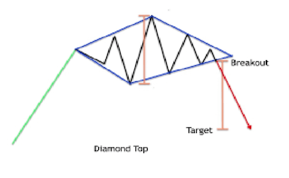 The price moves in a diamond shape, first expanding and then contracting. This usually warns of a trend reversal at a higher level. Expanding then contracting price action, often a top reversal.