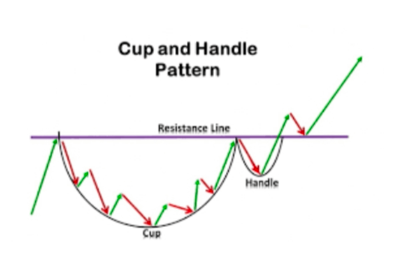 A 'U'-shaped cup forms, followed by a small downward correction (handle). This is followed by a bullish breakout, indicating a longer trend. Rounded bottom (cup) followed by a small dip (handle) before rising.