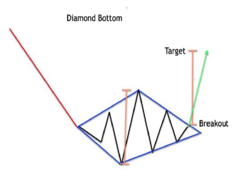 A diamond shape forms, but at the lower end of the trend. This may signal a potential bullish reversal after a decline. Expanding then contracting price action, often a bottom reversal.