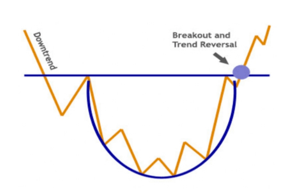 The price gradually falls, then slowly rises, forming a bowl-like shape. This is a calm and reliable signal of a bearish to bullish trend. Slow U-shaped recovery after a downtrend.
