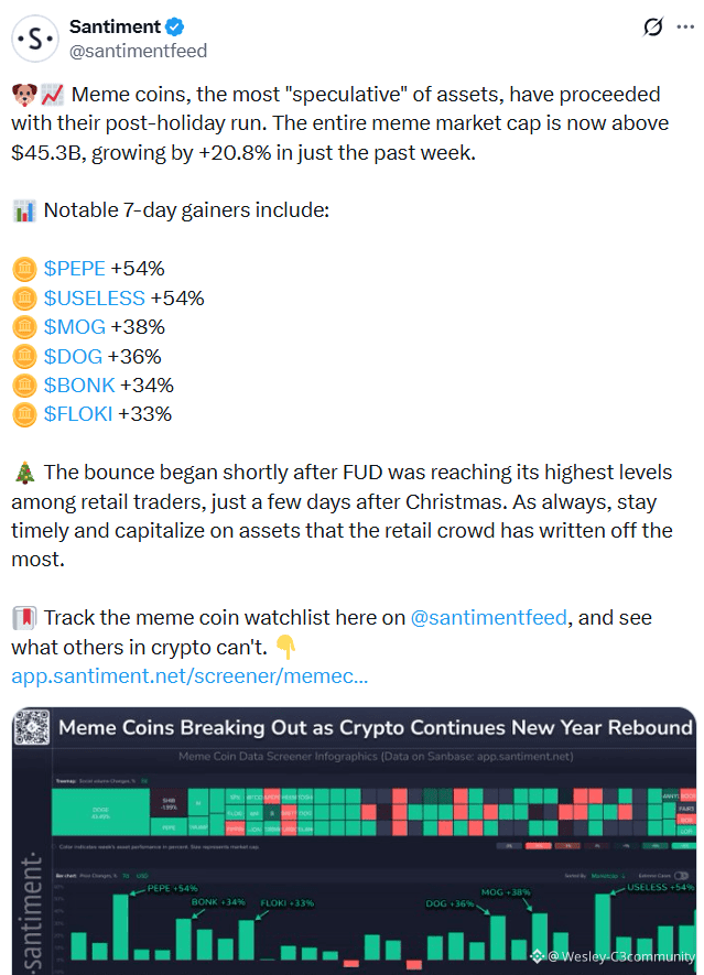 市场情报平台Santiment的分析师表示,MEME币的反弹“始于圣诞节后几天,当时散户交易者中的恐慌情绪已达到最高点”。