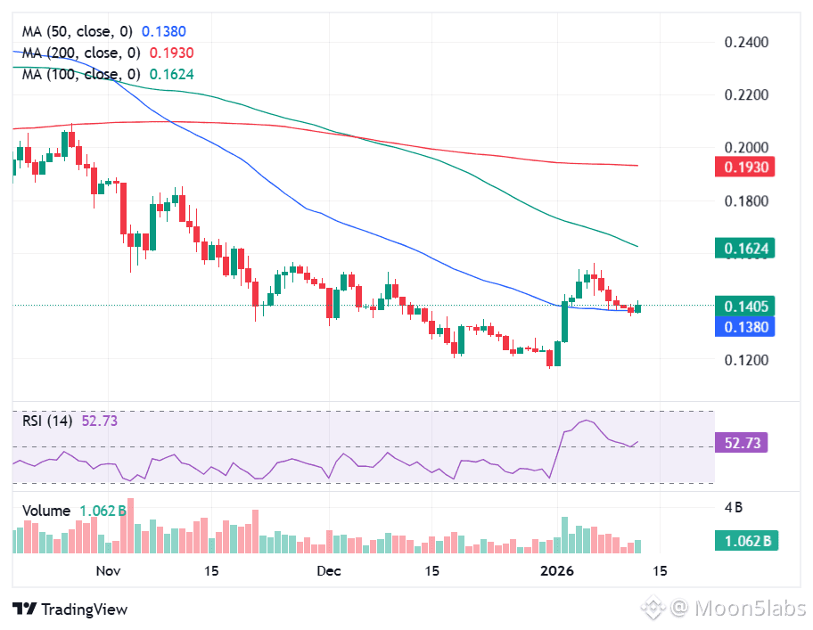 According to technical indicators, DOGE remains above the 50-day moving average (50-MA) at $0.138. The Relative Strength Index (RSI) sits at 52.96, suggesting a slightly bullish sentiment.