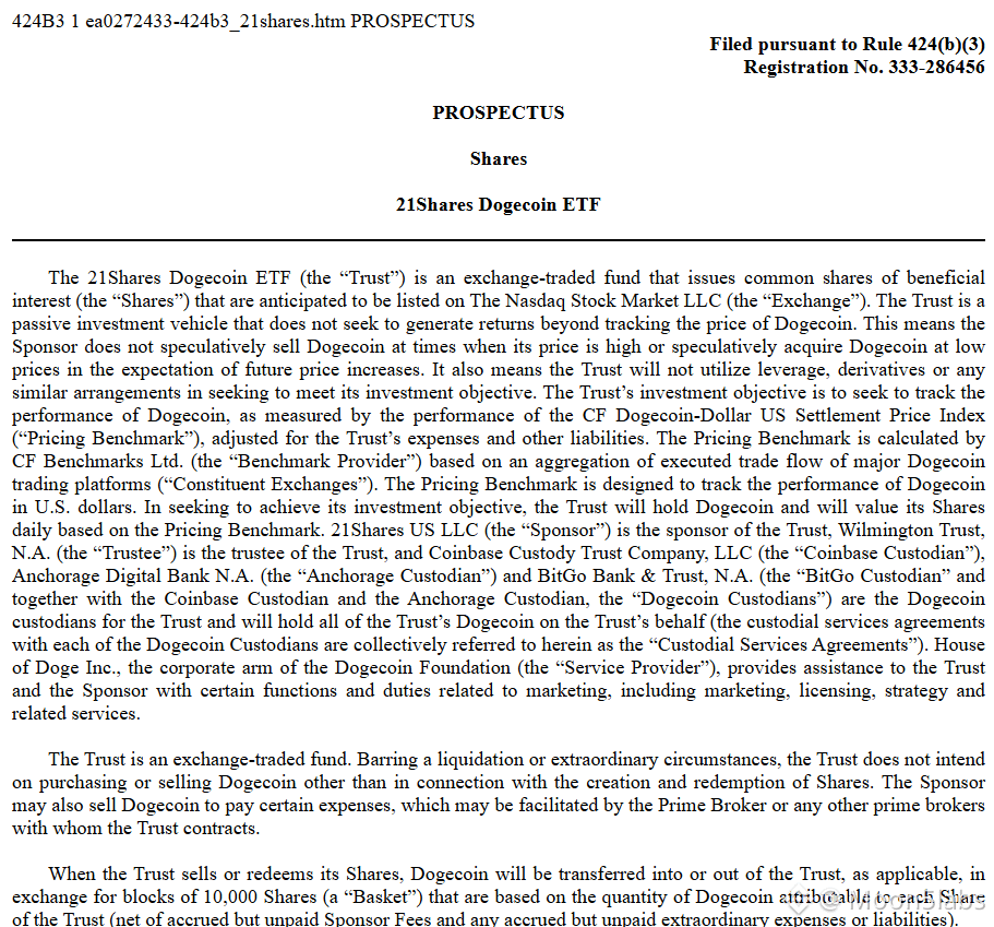 21Shares filed its official prospectus through Form 424B3 with the SEC, receiving the green light to move forward with the ETF launch this week. The fund will offer direct exposure to the spot price of Dogecoin, tracking the CF Dogecoin-Dollar US Settlement Price Index.